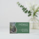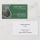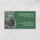 A business card template for forestry and timber companies with a photo of a blue harvester felling a conifer. On the front are the company name, address and contact details on a dark green panel separated from the photograph by a white wavy line. On the reverse is space for an employee's name and position, and any other information. This is on the white coloured card stock, with a customisable background colour on the reverse.