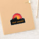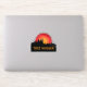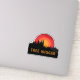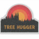 Colourful sticker for outdoor people, with a distressed sunrise (or sunset) behind a forest, and the words TREE HUGGER.