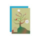 A mod artsy Christmas tree art piece featuring a perched cardinal, a single gift, and an ornament with your logo mark.