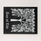Puzzle in a stylised, leaf and branch, tree of life design in white on black