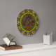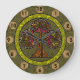 The background of this spectacular, battery operated wall clock looks just like a mossy green granite; overlaid with a traditional Japanese waterlily design that Leslie Sigal Javorek turned into a richly coloured Tree of Life w/ agate & burl wood finishes encircled with a ring of brighter green & what looks like brass rivets behind each numeral.