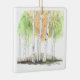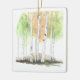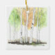 “A delicate watercolor scene of slender birch trees adorns this Christmas ornament, their white trunks and soft gray markings standing gracefully against a wash of gentle winter tones. Subtle hints of cool blues and muted greens evoke a peaceful forest moment, while the hand-painted style adds warmth and charm. A serene and elegant accent for any holiday décor.”