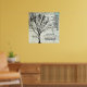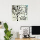 Christian tree poster with scripture from Psalm 1:1-3. 'Blessed is the man...he is like a tree planted by streams of water.' Inspirational verse about the prosperity of a man of belief. Grunge style, black tree branches over a graphic background with printed black text on a square poster.