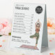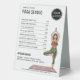Price list design for a yoga studio or for a yoga instructor offering lessons for customers. There are multiple personalizable text areas ideal for membership offers and class prices. The top has two personalizable text areas for the business name together with a spot for a custom logo. On the side there is Destei's original artwork featuring a yoga woman doing the tree pose on a pink colour yoga mat. The woman has long dark hair and she's wearing a brown colour tank top and green colour capri style leggings. There is also space to add business opening hours or some other text. The very bottom has another personalizable text area ideal for business website address and other contact information.