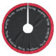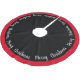 Holiday tree skirt is shown in an red and black with silver-grey text of Merry Christmas written in script all the way around the tree skirt with a solid colour border.