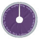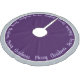 Holiday tree skirt is shown in a platinum and purple colour with lavender text of Merry Christmas written in script all the way around the tree skirt with a solid colour border.