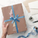 A mocha, muted brown background, white text. Decorated with a snowcovered pine tree. Merry Christmas is written with an elegant hand-lettered style script. Personalise and add your family name.
