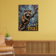 This captivating artwork captures a racoon with its characteristic markings, skilfully climbing a gnarled tree trunk. The background is a softly focused blend of dark blues and muted yellows, possibly indicating dusk or dawn in the forest. The phrase "CUTE BUT FERAL" is prominently featured in white, stylised letters at the bottom of the image, hinting at the animal's wild nature.