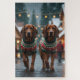 This festive design captures the joyful spirit of the holiday season, featuring an adorable dogs.Nestled in a winter wonderland, complete with a decorated Christmas tree, and beautifully wrapped presents. Snowflakes gently fall, adding a magical touch to the scene, while the vibrant colours of the holiday decorations create a warm and cheerful atmosphere.