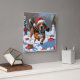 A spirited Treeing Walker Coonhound runs happily through the snowy winter scene, wearing a festive red Christmas hat. This lively design highlights the breed’s sleek coat, athletic build, and determined personality while capturing the warmth and joy of the holiday season. A heartwarming winter moment full of festive cheer.