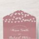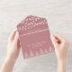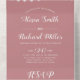 Trees and string lights on dusty rose winter all in one wedding invitation. It features white trees and string lights on dusty rose pink. The names are in script typography and the tear off RSVP card can be detached.