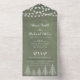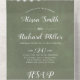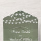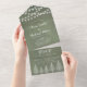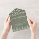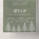 Trees and string lights on limed ash green all in one wedding invitation. It features white trees and string lights on green colour. The names are in script typography and the tear off RSVP card can be detached.