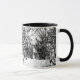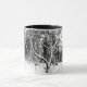 Coffee mug in a Winter scene of snow-covered trees with a winter woodland background - digitally enhanced photography in black and white