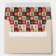Trees, ornaments, and stars on red, green and ecru squares creates a cute and fun envelope interior with a mid-century aesthetic. The outside is light tan.