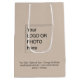Elevate your corporate gifting with our chic, light beige, medium shopping bag / gift bag, showcasing your logo or photo and customisable text in classic black.