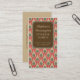 This interior designer business card has a salmon pink, grey, and cream abstract vintage peacock feather design in the background on the front. You can easily customise the business information on the front and back.