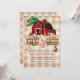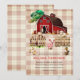 Trendy Rustic Country baby Shower Invitation featured barnyard with farm animals, red barn and plaid background.