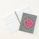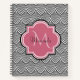 A trendy black art deco arched scallop pattern standard size notebook with a dark pink quatrefoil badge you can personalise by easily adding your own monogram and name. This is part of the Black Scallops Rapture Rose Monogram Spring Collection.