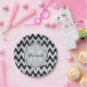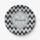 Trendy Black Grey Chevron Zigzag Name and Monogram Paper Plate