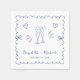 Trendy wedding napkins for your engagement party, rehearsal dinner, reception, etc., featuring a blue wavy frame adorned with coquette bows, whimsical hand drawn illustrations of hearts and toasting champagne glasses, and the names of the bride and groom in a fun, playful handwritten blue script.