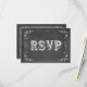 This design features a faux chalkboard background with fancy scrolls and hearts. Unique typography that reads: "R S V P". The reverse side of this trendy response card has the same scroll work design with custom text fields for your guests to fill in their response information. The chalkboard on this side is lightened up so that you can easily read your guest's response if they write in black ink. We have matching "eat, drink and be married" stamps, invitations and Thank You cards for this design!