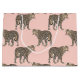 A luxurious leopard animal illustration pattern, over a light coral, light pink simple background. This wild cat seamless pattern, original art, elegant illustration, animal print, sophisticated artwork, girly, light, soft shabby chic leopard image, is ideal for everyday wear or home decor. A stylish, trendy, chic, girly artwork, simple art, elegant image.