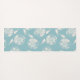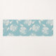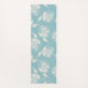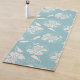 Trendy and feminine yoga mat printed with a hand drawn block-print dahlia floral botanical pattern by Anne Londez in cream on a duck egg dusty blue background. The initial is fully editable to personalise your mat.