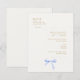 This chic and simple wedding RSVP response card features a blue ribbon bow watercolor illustration, a contemporary font in imitation gold,against an off white background and RSVP details. See full range of complimentary wedding stationary and supplies in the collection.