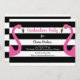 Fun pink flamingos accent this fun Graduation Invitation on a striped black and white background, making it perfect for a summer BBQ, luau, gathering by the pool, or summery party.