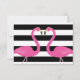 Fun pink flamingos accent this chic Wedding Response Card on a black and white striped background, making it perfect for a destination, beach, Hawaiian, Caribbean or tropical wedding. Coordinating items can be found in the Trendy Flamingo Wedding Collection.