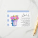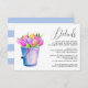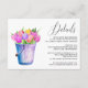 Trendy rustic style Wedding Details Card with a bucket full of tulips and flowers and white and blue striped pattern on the reverse of the card. These invites are perfect for a country, farmhouse, garden party or barnyard or style wedding shower.