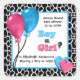 Is it a boy or girl? Send these fun 'save the date' gender reveal party stickers with a trendy black and white giraffe print border and a cool blue balloon for a boy next to a girly pink balloon for a girl and embellished with cute little pink and blue hearts. Personalise these fashionable animal print baby shower invites by adding the name of the Mother to be and the date of her party.