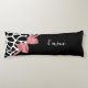 A trendy black and white giraffe print body pillow with a girly rosy pink ribbon tied into a cute bow. Personalise this elegant animal print design by adding your name. The reverse side has a graphic giraffe pattern. Flat printed image, not actual bow.