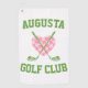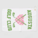 This customisable golf towel features two golf clubs in front of a chequered heart with the text "Augusta Golf Club". The text and colours for the graphic are all editable on this design.