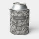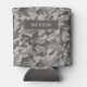 Stylish can cooler featuring a modern and trendy military camouflage pattern in shades of grey; the wording on top is customisable with your name or text of your choice in light grey lettering.