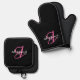 Trendy Hot Pink Black White Script Monogram Oven Mitt & Pot Holder Set