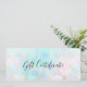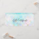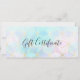 An elegant & trendy design of light pastel coloured geometric cube and triangle shapes of blue, lavender and pink, outlined in a faux sparkly gold texture. The design is repeated on the back of the card. The front features a customisable cursive script font for your gift certificate in black. The back also features this text, as well as a place to add your logo, a TO and FROM area for your gift certificate recipients, as well as a spot to fill in the monetary value of the certificate. Along the bottom of the gift certificate, you are able to fill in your additional business information such as your website and address.