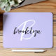 This elegant personalised mouse pad features a monogram and first name in modern black and white script on a trendy lavender background.