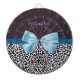 A trendy blue and plum leopard print dartboard with a cute blue ribbon bow wrapped like a present. Personalise by adding your name. Perfect present for a teen girly girl!