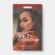A modern trendy style makeup artist business employee badge featuring white modern script typography and a glamourous photo. Upload your own glam photo.