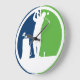 Trendy golf theme men's wall decor clock designed with an image of a golfer swinging, a golf bag and ball in action. Created as a man cave clock, office wall clock for a business executive, or man cave clock.