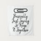 Trendy modern paperclip silhouette tapestry with the phrase "Basically just trying to keep it together" in black script.