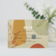 Trendy abstract RSVP card. Perfect for a modern wedding. Line protea flower and colourful shapes illustration on paper texture background. Red, yellow and green colours. Botanical minimalist style. Personalise with your text.