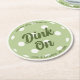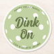 Trendy modern round pickleball paper coaster. Front features a large pickleball ball graphic. Back features a prominent statement "Dink On" surrounded by a personal message. Contact for assistance in personalising or customising to your wishes. Happy Holidays!