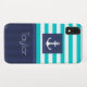 Modern nautical iPhone XR case with turquoise & navy blue striped pattern and customisable text.