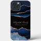 Modern Elegant Navy Blue Rose Gold Black Business iPhone Case. Gorgeous versatile design featuring on trend navy blue agate geode watercolor style abstract art with rose gold glitter accents. Background is shown in Black with customisable text shown in rose gold blush pink colour. Personalise with your business name and title (or any text you like). We invite you to visit our store Simon & Grace to view matching products and more. Please contact us if you require any assistance.
