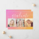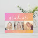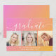 Trendy graduation announcement card featuring a pink to orange gradient background, three photos of the grad, "graduate" in stylish white script with swashes and their name, school and class year in simple modern white typography.