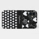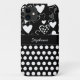 Trendy polka dots heart pattern iPhone 5 case features white polka dots and different style white hearts on a black background and a black accent border frame for your name, initial or other text. Show your personality with this trendy and unique iPhone 5 case. Makes a great gift for all occasions. Click the "Customise it!" button to change the text size, text colour, font style and more!