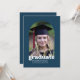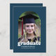Celebrate your graduate's milestone with our Trendy Retro Graduation Announcement in a navy colour palette This unique design captures the essence of nostalgia and modern style. The front showcases a stylish arch-shaped photo frame with a "graduate" inscription in retro typography, set against a blue backdrop. You can easily personalise it with your graduate's name and the school they are graduating from. The back of the announcement offers space for a second photo and a customisable blurb, where you can share your graduate's exciting future plans. Make this special moment unforgettable with a touch of vintage charm and contemporary flair.