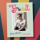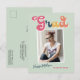 Trendy retro photo, graduation announcement postcards, featuring design elements of vintage style typography reading "Grad" in boho colours of the rainbow. The graduates photo is highlighted with thin white boarders. Light mint green background colour or easily edit and change the colour as needed. The back of the card offers personalised text spaces for information about your graduation. Perfect for the high school, college and university grad.